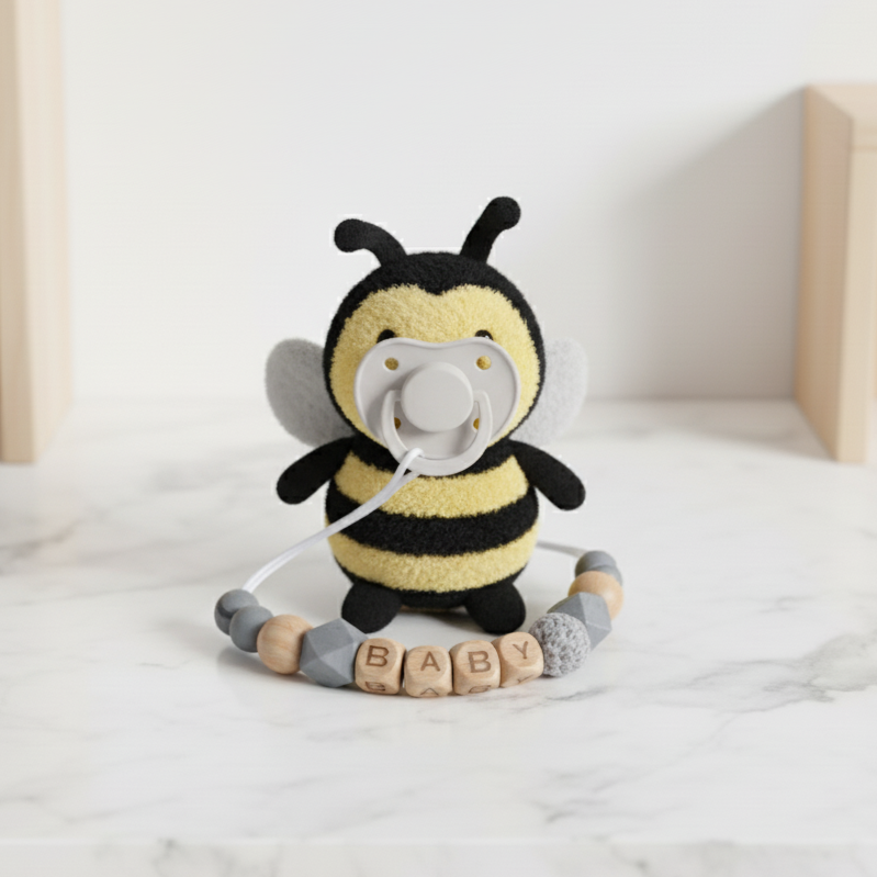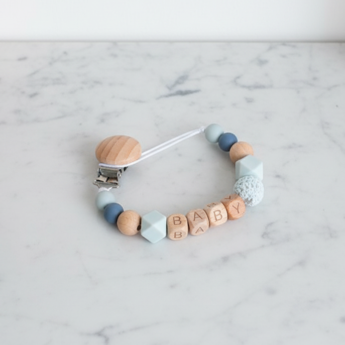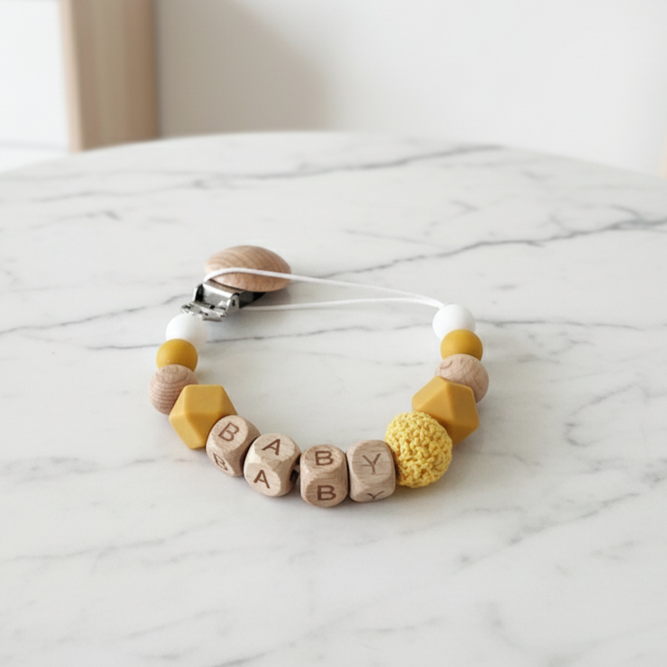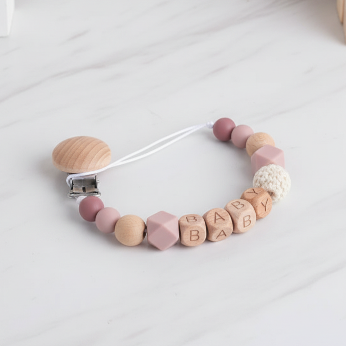 Chupetero de madera y silicona, seguro y libre de BPA.